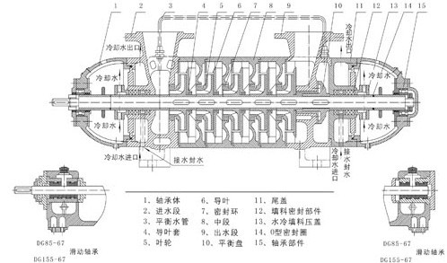 次高壓泵一般采用滑動軸承、稀油潤滑結構,DG85-6 7、DG155-67型泵可采用滑動軸承、 稀油潤滑,也可采用滾動軸承、干油潤滑結構,其余型號均采用滾動軸承、干油潤滑結構。中、低壓泵的主要零件材料一般采用優(yōu)質鑄鐵,次高壓泵主要零件采用鑄鋼或不銹鋼。該系列泵通過彈性聯(lián)軸器由原動機直接驅動,從原動機方向看,泵為順時針方向旋轉。