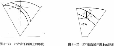 用一個(gè)垂直軸面截線的EF線(圖8-23)為母線的錐面去截葉片,并展開(kāi)在平面上(圖8-25)。因?yàn)樵撁娲怪比~片上的線(軸面截線),所以其上反映葉片的真實(shí)厚度δ,由此圓錐面上的圓周方向的厚度應(yīng)等于流面上的圓周厚度,由圖8-25