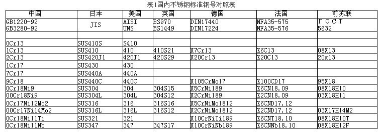 馬氏體不銹鋼的代表鋼號為1Cr13、2Cr13、3Cr13、4Cr13等,鐵素體不銹鋼的代表鋼號為1Cr17、1Cr17Ti、 1Cr25等,奧氏體不銹鋼的代表鋼號為1Cr18Ni9Ti、0Cr18Ni9(304)、00Cr18Ni9Ti(304L)、 0Cr17Ni12Mo2(316)、00Cr17Ni14Mo2(316L)、0Cr18Ni11Ti(321)、0Cr18Ni11Nb(347) 等,雙相不銹鋼的代表鋼號為00Cr26Ni7Mo2Ti等。