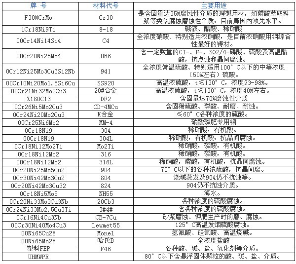 在抗腐蝕材料中,氟塑料具有無可比擬的優(yōu)異性能,除了熔融堿金屬、元素氟及芳香烴類和濃硝酸在170℃以上有腐蝕現(xiàn)象外,在其余各種濃度的鹽酸、硫酸、硝酸、王水、有機(jī)酸、強(qiáng)氧化劑、濃、稀酸交替,酸、堿交替和各種有機(jī)溶劑中均呈 惰 性反應(yīng)。將其內(nèi)襯于泵、閥內(nèi)壁,既克服了氟塑料材料強(qiáng)度低的缺點(diǎn),又解決了泵、閥主體材料抗腐蝕性能差、成本高的不足。另外,氟塑料除了具有優(yōu)異的化學(xué)穩(wěn) 定性外,其防污、防粘性好、動(dòng)靜摩擦系數(shù)值極小且相近,減摩潤滑性能良好,將其做為閥門啟、閉件的密封副,可降低密封面間磨擦力,減小閥門操作扭矩,提高 產(chǎn)品使用壽命,其使用范圍還可擴(kuò)展到食品、醫(yī)藥工業(yè)。其內(nèi)襯材料除PTFE(F4)、FEP(F46)、PVDF(F2)外,又?jǐn)U展到聚烯烴類的PE、PP及PVC范圍,以滿足各種不同工況參數(shù)的需要。我公司氟塑料泵產(chǎn)品主要有兩大類型,一類為全氟(氟塑料合金)型耐腐蝕泵,(此類為小型泵);一類為全內(nèi)襯氟塑料(F46)型耐腐蝕泵,(此內(nèi)為大型泵)。