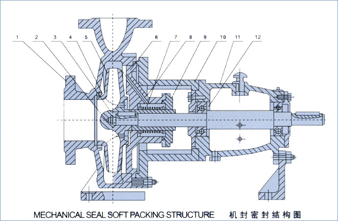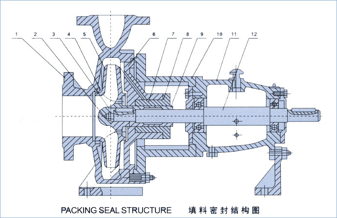 IH型化工泵結構圖1、泵體2、葉輪螺母3、止動墊圈4、密封環(huán)5、葉輪6、泵蓋7、機械密封8、填料壓蓋9、軸套10、中間托架11、懸架12、泵軸