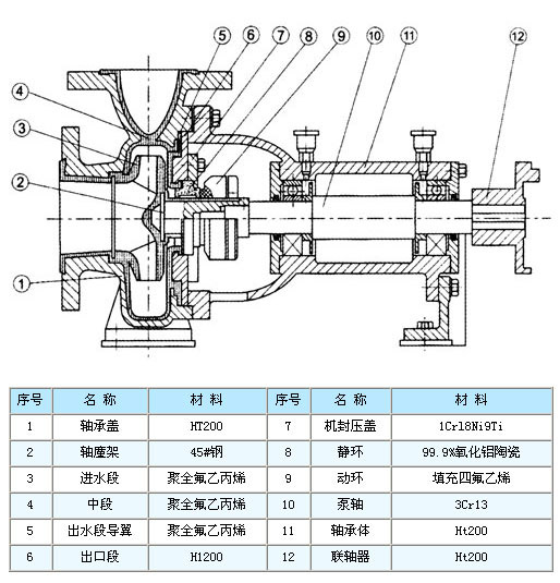 IHF型泵為單級單吸式氟塑料合金化工離心泵(簡稱冷硫酸增壓泵),是按國標設計并結(jié)合非金屬泵的加工工藝設計生產(chǎn)的。該泵具有耐腐蝕、耐磨、耐高溫、不老化、機械強度高、無毒分解、使用溫度寬等優(yōu)點。泵體采用金屬外殼內(nèi)襯聚全氟乙丙烯(F46)、葉輪和泵蓋均采用金屬嵌件外包氟塑料整體燒結(jié)壓制成型,軸封采用外裝式波紋管機械密封。