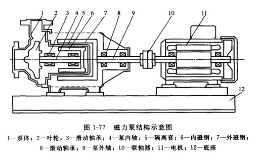 磁力傳動在離心泵上的應(yīng)用與一切磁傳動原理一樣,是利用磁體能吸引鐵磁物質(zhì)以及磁體或磁場之間有磁力作用的特性,而非鐵磁物質(zhì)不影響或很少影響磁力的大小,因此可以無接觸地透過非磁導(dǎo)體(隔離套)進(jìn)行動力傳輸,這種傳動裝置稱為磁性聯(lián)軸器.如圖1-77所示,磁力泵主要由泵體、葉輪、內(nèi)磁鋼、外磁鋼、隔離套、泵內(nèi)軸、泵外軸、滑動軸承、滾動軸承、聯(lián)軸器、電機(jī)、底座等組成(有些小型的磁力泵,將外磁鋼與電機(jī)軸直接連在一起.省去泵外軸、滾動軸承和聯(lián)軸器等部件)。電動機(jī)通過聯(lián)軸器和外磁鋼連在一起,葉輪和內(nèi)磁鋼連在一起。在外磁鋼和內(nèi)磁鋼之間設(shè)有全密封的隔離套,將內(nèi)、外磁鋼完全隔開.使內(nèi)磁鋼處于介質(zhì)之中,電動機(jī)的轉(zhuǎn)軸通過磁鋼間磁極的吸力直接帶動葉輪同步轉(zhuǎn)動。