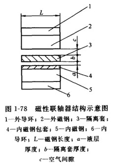 磁性聯(lián)軸器由內(nèi)磁鋼(含導(dǎo)環(huán)和包套)、外進(jìn)鋼(含導(dǎo)環(huán))及隔離套組成(見圖1-78),是磁力泵的核心部件。磁性聯(lián)軸器的結(jié)構(gòu)、磁路設(shè)計(jì),及其各零部件的材料關(guān)系到進(jìn)力泵的可靠性,磁傳動效率及壽命。