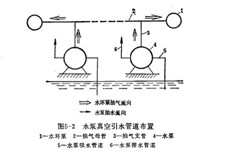 如果泵站中有兩臺以上的水泵,則可將水環(huán)式真空泵進氣管與抽氣母管相通,每臺泵的泵殼頂部通過抽氣支管與抽氣母管相連。在每個支管上都安裝一個閥門,以便可以單獨對每一臺泵抽氣。有時,為了備用起見,可以設(shè)置兩臺水環(huán)式真空泵,每一臺的進氣管上都安上閥門。當一臺發(fā)生故障時,可以關(guān)閉該泵上的進氣閥門,利用另外一臺抽氣,不致耽誤水泵的起動。正常情況下兩臺水環(huán)式真空泵可對水泵同時抽氣,以加快引水速度。整個管路布置如圖5-2所示。