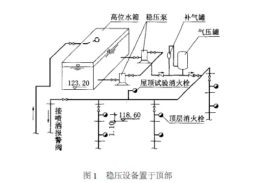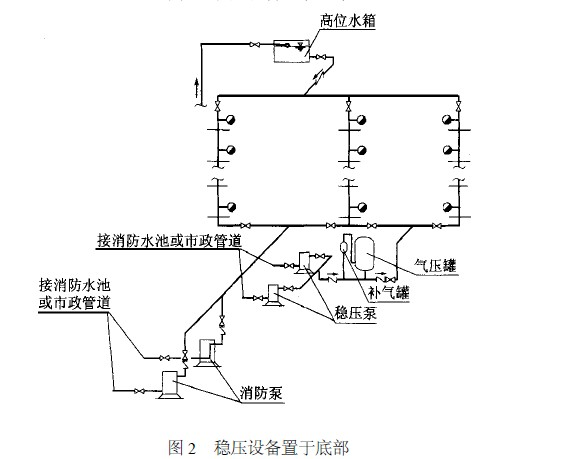 當(dāng)建筑物頂部有消防水箱,但放置穩(wěn)壓設(shè)備有困難時(shí),多層建筑經(jīng)常將穩(wěn)壓設(shè)備放在首層或地下室內(nèi),如圖2 所示。高層建筑由于高位消防水箱距地面高差較大,若將穩(wěn)壓設(shè)備放在首層或地下室時(shí),系統(tǒng)的工作壓力較大,可能引起系統(tǒng)超壓(超過(guò)管道的允許使用壓力) ,故推薦采用放在建筑物頂部的方案。