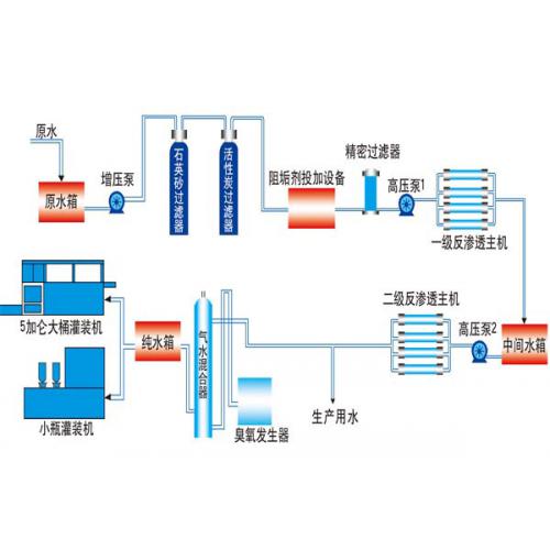 原水不銹鋼CDLF多級(jí)離心泵加壓泵-多介質(zhì)過(guò)濾器-活性炭過(guò)濾器-軟水器-保安過(guò)濾器-第一級(jí)反滲透機(jī)-第二級(jí)反滲透機(jī)-儲(chǔ)水罐-純水輸送不銹鋼CDLF多級(jí)離心泵-用水點(diǎn)。