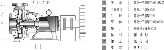 2) 泵體為鋼襯超高分子量聚乙烯結構,襯里厚度為8~20mm,該泵應用了襯塑專利技術,和其它同類泵相比較,具有襯里層抗熱變形性能好,耐開裂,防脫落,使用溫度高等優(yōu)勢。
