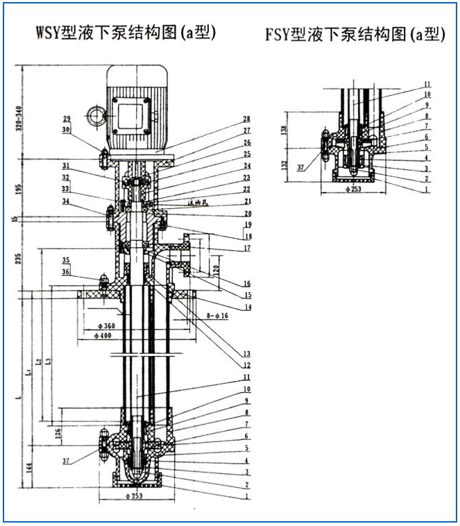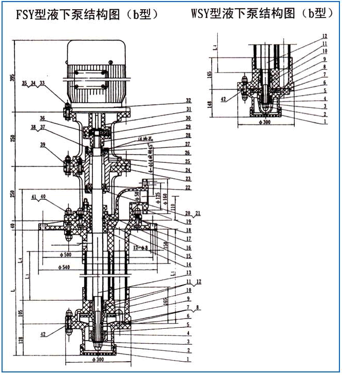 WSY型、FSY型兩種型式的泵,1.WSY型泵為立式玻璃鋼液下旋渦泵。2.FSY型泵為立式玻璃鋼液下離心泵,該泵因伸入貯罐,貯槽的深度長短不同,設(shè)計(jì)液下深度800mm--3000mm之間任意選擇。只要液體高于泵體,即可不灌液而起動送液,平蓋板下設(shè)有泄漏孔,液體不會向貯罐外泄漏。