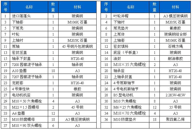 本泵與介質(zhì)接觸的零部件,系用聚乙烯醇縮丁醛改性酚醛玻璃纖維,經(jīng)高溫模壓成型的酚醛玻璃鋼制件,聯(lián)接管、出液管采用半干法卷制工藝制成的酚醛玻璃鋼管,葉輪軸套的裝配均用酚醛膠泥和泵軸粘成一體,液下各部裝配均用酚醛膠泥粘結(jié),伸入液下全無金屬與介質(zhì)接觸,耐腐性能絕對可靠,產(chǎn)品具有輕質(zhì)、高強(qiáng)、不變形、耐溫、耐腐蝕等優(yōu)良性能,在防腐方面可部分替代含鉬不銹鋼、鈦及鈦合金等貴重金屬。
