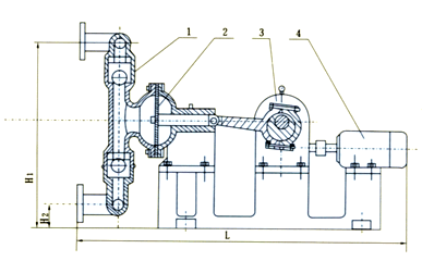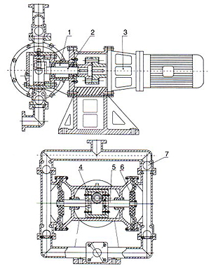 電機(jī)(4)通過減速箱(3)帶動(dòng)左右兩端柱塞上面的隔膜(2)一前一后往復(fù)運(yùn)動(dòng)。在左右兩個(gè)泵腔內(nèi),裝有上下四個(gè)單向球閥(1)隔膜的運(yùn)動(dòng),造成工作腔內(nèi)的容積的改變,迫使四個(gè)單向球閥交替地開啟和關(guān)閉,從而將液體不斷地吸入和排出。